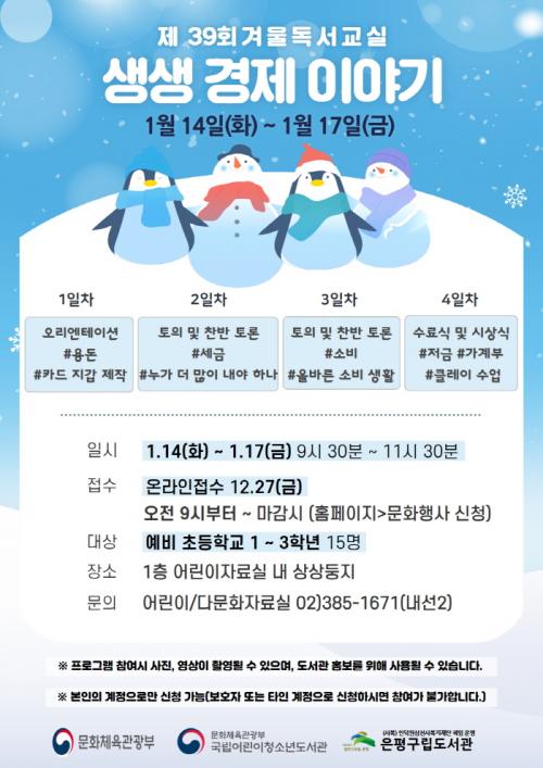 [½Åµ¿¾Æ¹æ¼Û ÀºÆò±¸=À̽ŵ¿±âÀÚ] ÀºÆò±¸´Â ÀºÆò±¸¸³µµ¼­°üÀÌ ¹æÇÐÀ» ¸Â¾Æ ¿À´Â 14ÀϺÎÅÍ 17ÀϱîÁö ÃʵîÇб³ ÀúÇгâÀ» ´ë»óÀ¸·Î ¡®»ý»ý °æÁ¦ À̾߱⡯ °Ü¿ïµ¶¼­±³½ÇÀ» ¿î¿µÇÑ´Ù°í ¹àÇû´Ù. À̹ø °Ü¿ïµ¶¼­±³½ÇÀº ±¹¸³¾î¸°ÀÌû¼Ò³âµµ¼­°üÀÌ Áö¿øÇÏ°í °ø°øµµ¼­°üÀÌ ¿î¿µÇÏ¡¦