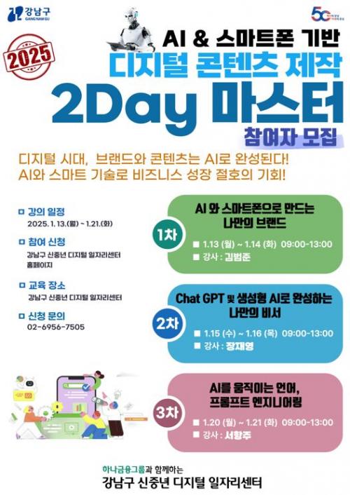 [½Åµ¿¾Æ¹æ¼Û °­³²±¸=À̽ŵ¿±âÀÚ] ²ÞÀÌ ¸ðÀÌ´Â µµ½Ã, ¹Ì·¡¸¦ ±×¸®´Â °­³²±¸°¡ ½ÅÁß³â(40~64¼¼)À» ´ë»óÀ¸·Î ¡®AI&½º¸¶Æ®Æù ±â¹Ý µðÁöÅÐ ÄÜÅÙÃ÷ Á¦ÀÛ 2Day ¸¶½ºÅÍ ±³À°¡¯À» ¿À´Â 1¿ù 13ÀϺÎÅÍ 21ÀϱîÁö °­³²±¸ ½ÅÁ߳⠵ðÁöÅÐ ÀÏÀÚ¸®¼¾ÅÍ(Çе¿·Î 343)¿¡¼­ ¿î¿µÇÑ´Ù. À̹ø¡¦