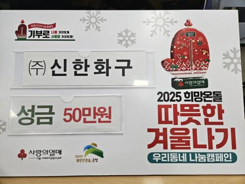 [½Åµ¿¾Æ¹æ¼Û ÀºÆò±¸=À̽ŵ¿±âÀÚ] ÀºÆò±¸ ºÒ±¤1µ¿Àº Áö³­´Þ 19ÀÏ ÁÖ½Äȸ»ç ½ÅÇÑÈ­±¸·ÎºÎÅÍ µû¶æÇÑ °Ü¿ï³ª±â ¼º±Ý 50¸¸ ¿øÀ» Àü´Þ¹Þ¾Ò´Ù°í ¹àÇû´Ù. ¡®µû¶æÇÑ °Ü¿ï³ª±â¡¯ Ä·ÆäÀÎÀº ¾î·Á¿î ÀÌ¿ôÀ» µ½±â À§ÇØ Áö¿ªÁֹεéÀÌ ÇÔ²² ±âºÎÇϴ Ȱµ¿À¸·Î ¸ÅÇØ ÀÌ·ç¾îÁö°í ÀÖ´Ù.¡¦