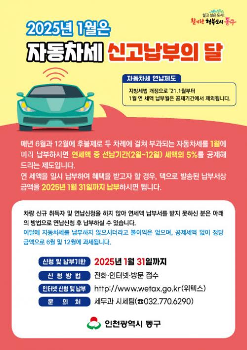 [½Åµ¿¾Æ¹æ¼Û = À±¹Î½Ä±âÀÚ] ÀÎõ µ¿±¸(±¸Ã»Àå ±èÂùÁø)´Â ¿À´Â 1¿ù 31ÀϱîÁö 1³âºÐ ÀÚµ¿Â÷¼¼¸¦ ¹Ì¸® ³³ºÎÇÏ¸é ¼±³³±â°£ (2¿ù~12¿ù) ¼¼¾×ÀÇ 5%¸¦ °øÁ¦ÇØ ÁÖ´Â ¿¬(Ò´) ¼¼¾× ÀϽà ³³ºÎ ½ÅûÀ» ¹Þ´Â´Ù°í ¹àÇû´Ù. Áö³­ÇØ ÀÚµ¿Â÷¼¼¸¦ ¿¬³³ÇÑ Â÷·® ¼ÒÀ¯ÀÚ µîÀº º°µµÀÇ ½Åû¡¦