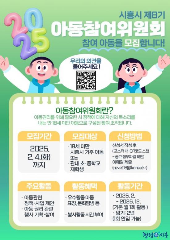 [½Åµ¿¾Æ¹æ¼Û ½ÃÈï½Ã=À̽ŵ¿±âÀÚ] ½ÃÈï½Ã´Â ¡®Á¦8±â ½ÃÈï½Ã ¾Æµ¿Âü¿©À§¿øÈ¸¡¯¸¦ »õ·Ó°Ô ±¸¼ºÇϰíÀÚ Âü¿© ¾Æµ¿À» 2¿ù 4ÀϱîÁö ¸ðÁýÇÑ´Ù. ¾Æµ¿Âü¿©À§¿øÈ¸´Â ¾Æµ¿ÀÇ ±Ç¸® ÁõÁø°ú Á¤Ã¥ Âü¿©¸¦ ¸ñÇ¥·Î ÇÑ ½ÃÈï½ÃÀÇ ´ëÇ¥ÀûÀÎ ¾Æµ¿ Âü¿© ±â±¸·Î, ±Â³×À̹ö½º °æ±â¼­ºÎÁöºÎ¿Í Çù¡¦