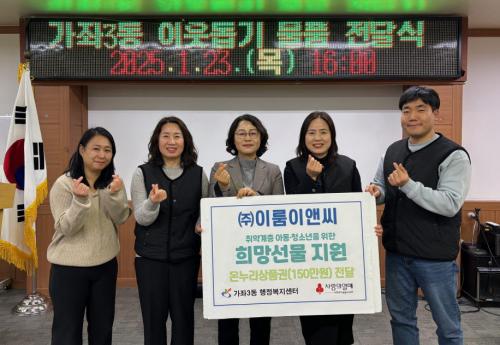 [½Åµ¿¾Æ¹æ¼Û ÀÎõ= À±¹Î½Ä±âÀÚ] ÀÎõ ¼­±¸ °¡ÁÂ3µ¿Àº Áö¿ª»çȸº¸ÀåÇùÀÇü(°øµ¿À§¿øÀå ±è¼ºÁÖ, ÀÌÃáÀÚ) Áö³­ 23ÀÏ ¢ßÀÌ·ëÀ̾ؾ¾(´ëÇ¥ ¼Õ¿¬Èñ)·ÎºÎÅÍ °ü³» Ãë¾à°èÃþ ¾Æµ¿¡¤Ã»¼Ò³âÀ» À§ÇÑ ¡®Èñ¸Á ¼±¹°¡¯ ¿Â´©¸® »óǰ±Ç 150¸¸¿øÀ» Àü´Þ¹Þ¾Ò´Ù. °¡ÁÂ3µ¿ ±è¼ºÁÖ µ¿ÀåÀº¡¦