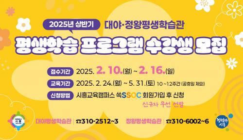 [½Åµ¿¾Æ¹æ¼Û ½ÃÈï½Ã=À̽ŵ¿±âÀÚ] ½ÃÈï½Ã ´ë¾ß¤ýÁ¤¿ÕÆò»ýÇнÀ°üÀº ¿À´Â 2¿ù 10ÀϺÎÅÍ 16ÀϱîÁö ¡®2025³âµµ »ó¹Ý±â Æò»ýÇнÀ ÇÁ·Î±×·¥¡¯ÀÇ ¼ö°­»ýÀ» ¸ðÁýÇÑ´Ù. ÇÁ·Î±×·¥Àº 2¿ù 24ÀϺÎÅÍ 10~12ÁÖ°£ ¿î¿µµÈ´Ù. À̹ø ÇÁ·Î±×·¥Àº ½Ã¹ÎµéÀÇ ´Ù¾çÇÑ ÇнÀ ¼ö¿ä¸¦ ÃæÁ·Çϱâ À§ÇØ ½Å¡¦