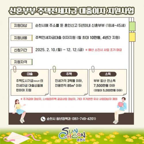[½Åµ¿¾Æ¹æ¼Û ¼øÃµ=±è³²±â ±âÀÚ] ¼øÃµ½Ã(½ÃÀå ³ë°ü±Ô)´Â ½ÅÈ¥ºÎºÎ û³âµéÀÇ Áְźñ °æ°¨À» À§ÇØ ¡®½ÅÈ¥ºÎºÎ ÁÖÅÃÀü¼¼ÀÚ±Ý ´ëÃâÀÌÀÚ Áö¿ø»ç¾÷¡¯ ½Å±Ô ´ë»óÀÚ¸¦ ¿À´Â 10ÀϺÎÅÍ ¸ðÁýÇÑ´Ù°í ¹àÇû´Ù. ½ÅÈ¥ºÎºÎ ÁÖÅÃÀü¼¼ÀÚ±Ý ´ëÃâÀÌÀÚ Áö¿ø»ç¾÷Àº ¼øÃµ½Ã¿¡ °ÅÁÖÇÏ´Â ¹«ÁÖÅá¦