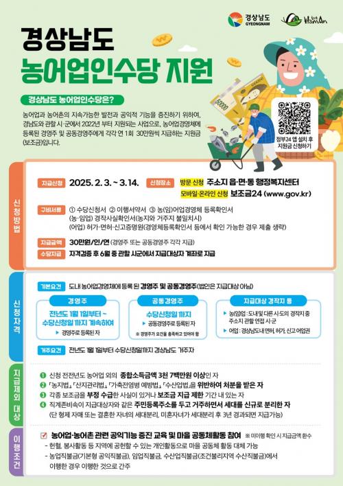 [½Åµ¿¾Æ¹æ¼Û °æ³²ÇÔ¾È=À̽ŵ¿±âÀÚ] ÇԾȱºÀº ÀÌ´Þ 3ÀϺÎÅÍ ¿À´Â 3¿ù 14ÀϱîÁö ¡®³ó¾î¾÷Àμö´ç Áö¿ø»ç¾÷¡¯À» ½Åû¹Þ´Â´Ù. Áö±Þ ´ë»óÀÚ´Â 2024³â 1¿ù 1ÀϺÎÅÍ ¼ö´ç ½ÅûÀϱîÁö °æ»ó³²µµ¿¡ °ÅÁÖÇϸ鼭 ³ó¾î¾÷°æ¿µÃ¼¿¡ µî·ÏµÈ °æ¿µÁÖ¿Í °øµ¿°æ¿µÁÖÀ̸ç, °øµ¿°æ¿µÁÖ´Â ³ó¡¦