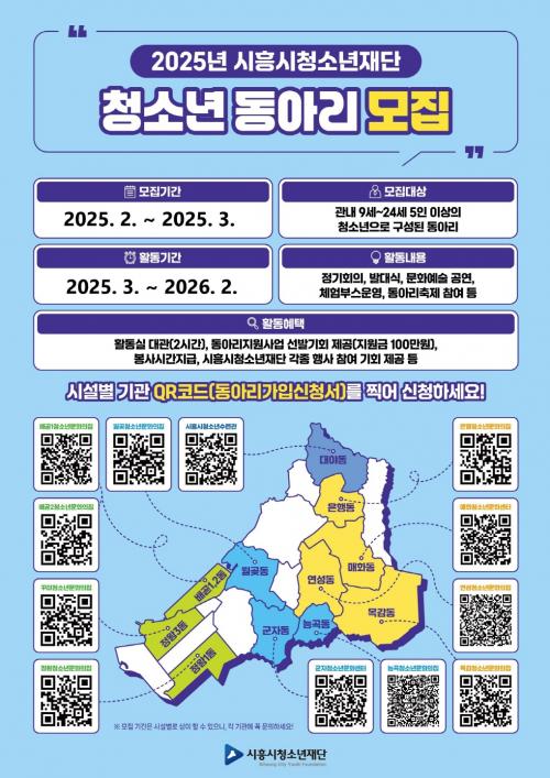 [½Åµ¿¾Æ¹æ¼Û ½ÃÈï½Ã=À̽ŵ¿±âÀÚ] Àç´Ü¹ýÀÎ ½ÃÈï½Ãû¼Ò³âÀç´Ü ³» 12°³ÀÇ Ã»¼Ò³â½Ã¼³¿¡¼­ û¼Ò³âµéÀÇ ´Ù¾çÇÏ°í °ÇÀüÇÑ µ¿¾Æ¸® Ȱµ¿À» Áö¿øÇϰíÀÚ 2025³â û¼Ò³âµ¿¾Æ¸®¸¦ 2¿ùºÎÅÍ 3¿ù±îÁö µÎ ´Þ°£ ±â°üº°·Î ¸ðÁýÇÑ´Ù. ½ÃÈï½Ãû¼Ò³âÀç´Ü ³» û¼Ò³âµ¿¾Æ¸® ¸ðÁý ±â°üÀº ½ÃÈ