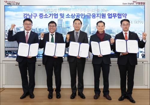[½Åµ¿¾Æ¹æ¼Û °­³²±¸=À̽ŵ¿±âÀÚ] ²ÞÀÌ ¸ðÀÌ´Â µµ½Ã, ¹Ì·¡¸¦ ±×¸®´Â °­³²±¸°¡ °æ±âħü¿Í ¹°°¡»ó½ÂÀ¸·Î ¾î·Á¿òÀ» °Þ´Â Áß¼Ò±â¾÷¡¤¼Ò»ó°øÀÎÀÇ ±ÝÀ¶ ºÎ´ãÀ» ´ú±â À§ÇØ 12ÀÏ ¼­¿ï½Å¿ëº¸ÁõÀç´Ü, ½ÅÇÑÀºÇà, ¿ì¸®ÀºÇà, ÇϳªÀºÇà(°¡³ª´Ù¼ø)°ú ¾÷¹« Çù¾àÀ» ü°áÇß´Ù. À̹ø Çù¾àÀ»¡¦