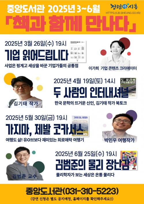 [½Åµ¿¾Æ¹æ¼Û ½ÃÈï½Ã=À̽ŵ¿±âÀÚ] ½ÃÈï½ÃÁß¾Óµµ¼­°üÀÌ ÀÛ°¡¿Í ÇÔ²²ÇÏ´Â ½Éµµ Àִ å À̾߱â, ¡®Ã¥°ú ÇÔ²² ¸¸³ª´Ù¡¯ÀÇ 2025³â 3¿ùºÎÅÍ 6¿ù±îÁöÀÇ ÀÛ°¡ Ã⿬ÁøÀ» °ø°³Çß´Ù. ¡®Ã¥°ú ÇÔ²² ¸¸³ª´Ù¡¯´Â ¸Å¿ù ÇÑ ¹ø¾¿ ÁøÇàµÇ´Â °­¿¬ ÇÁ·Î±×·¥À¸·Î, 3¿ùºÎÅÍ 6¿ù±îÁö °¢ ºÐ¾ßÀÇ Àú¡¦