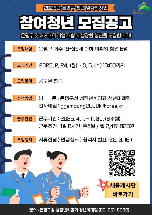 [½Åµ¿¾Æ¹æ¼Û ÀºÆò±¸=À̽ŵ¿±âÀÚ] ÀºÆò±¸´Â û³â ÀÏÀÚ¸®»ç¾÷À» ÅëÇØ °ü³» 8°³ÀÇ ±â¾÷°ú ÇÔ²² ¼ºÀåÇÒ Ã»³â 8¸íÀ» ³»´Þ 5ÀϱîÁö ¸ðÁýÇÑ´Ù°í ¹àÇû´Ù. û³â ÀÏÀÚ¸®»ç¾÷Àº û³â¿¡°Ô ÀûÇÕÇÑ Áö¿ª ÀÏÀÚ¸®¸¦ ¹ß±¼Çϰí Á¦°øÇØ °æÁ¦È°µ¿ ÁøÀÔ°ú Á÷¹«¿ª·® °­È­¸¦ Áö¿øÇÏ´Â »ç¾÷ÀÌ¡¦