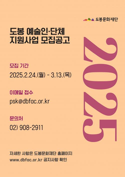 [½Åµ¿¾Æ¹æ¼Û µµºÀ±¸=À̽ŵ¿±âÀÚ] µµºÀ±¸ µµºÀ¹®È­Àç´ÜÀÌ ¿À´Â 3¿ù 13ÀϱîÁö ¡®2025 µµºÀ ¿¹¼úÀΡ¤´Üü Áö¿ø»ç¾÷¡¯ °ø¸ð¸¦ ÁøÇàÇÑ´Ù. º» »ç¾÷Àº µµºÀ±¸¸¦ ±â¹ÝÀ¸·Î Ȱµ¿Çϰí ÀÖ´Â ¿¹¼úÀÎ(´Üü)ÀÇ Ã¢ÀÛ°ú ¿¹¼ú Ȱµ¿À» Áö¿øÇÏ´Â »ç¾÷ÀÌ´Ù. °æºñ µîÀ» Áö¿øÇϸç, Áö¿ª¡¦