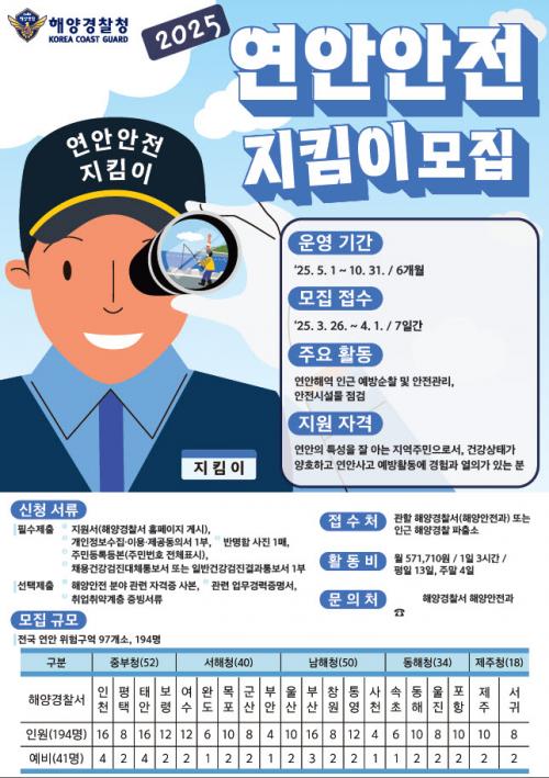 [½Åµ¿¾Æ¹æ¼Û ÀÎõ= À±¹Î½Ä±âÀÚ] ÇØ¾ç°æÂûû(ûÀå ±è¿ëÁø)Àº 5¿ùºÎÅÍ 10¿ù±îÁö 6°³¿ù°£ Àü±¹ ¿¬¾È À§Ç豸¿ª 97°³¼Ò¿¡¼­ Ȱ¾àÇÒ ¡®¿¬¾È¾ÈÀüÁöÅ´ÀÌ¡¯¸¦ ÃÑ 194¸í ¼±¹ß, ¹èÄ¡ÇÏ¿© ¿¬¾È ¾ÈÀü»ç°í ¿¹¹æ Ȱµ¿À» Áö¿øÇÒ °èȹÀ̶ó°í ¹àÇû´Ù. ¡®¿¬¾È¾ÈÀüÁöÅ´ÀÌ¡¯´Â ¿¬¾ÈÀÇ Æ¯¡¦