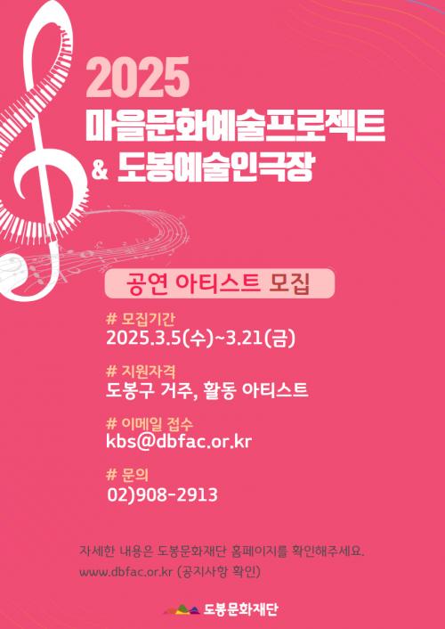 [½Åµ¿¾Æ¹æ¼Û µµºÀ±¸=À̽ŵ¿±âÀÚ] µµºÀ±¸ µµºÀ¹®È­Àç´ÜÀÌ ¿À´Â 3¿ù 21ÀϱîÁö ¡®2025 ¸¶À»¹®È­¿¹¼úÇÁ·ÎÁ§Æ®‧µµºÀ¿¹¼úÀαØÀ塯 Âü¿© ¿¹¼ú°¡¸¦ ¸ðÁýÇÑ´Ù. ¸ðÁý ´ë»óÀº Áö¿ª ³» °ÅÁÖ ¶Ç´Â Ȱµ¿Çϰí ÀÖ´Â °ø¿¬¿¹¼úÀÎÀÌ´Ù. ÃÑ 25ÆÀ(°³ÀÎ Æ÷ÇÔ)À» ¸ðÁýÇϸç, ¼­·ù ½É»ç¿Í¡¦
