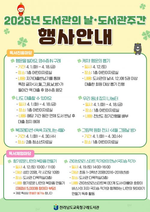 [½Åµ¿¾Æ¹æ¼Û Àü³²±¸·Ê=À̽ŵ¿±âÀÚ] Àü¶ó³²µµ±³À°Ã»±¸·Êµµ¼­°üÀº 2025³â µµ¼­°üÀÇ ³¯(4¿ù 12ÀÏ)°ú µµ¼­°ü ÁÖ°£(4¿ù 12ÀÏ~18ÀÏ)À» ¸Â¾Æ ¡®²ÞÀ» Ű¿ì´Â ¾¾¾Ñ, µµ¼­°ü¿¡ ¹¯´Ù¡¯¸¦ ÁÖÁ¦·Î ´Ù¾çÇÑ µ¶¼­¹®È­ÁøÈï Çà»ç¸¦ ¿î¿µÇÑ´Ù. 4¿ù 1ÀÏ(È­)ºÎÅÍ ÁøÇàµÇ´Â À̹ø Çà»ç´Â µµ¡¦