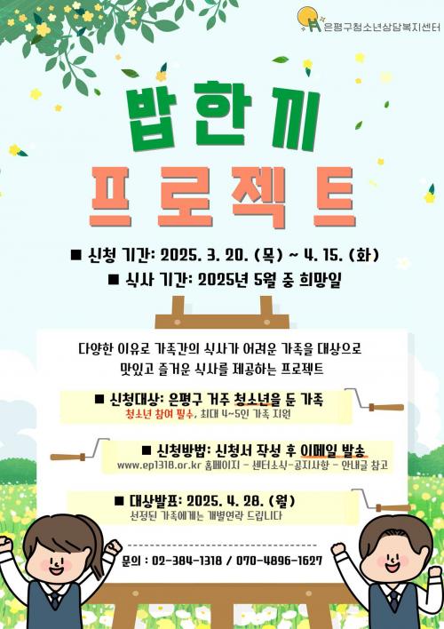 [½Åµ¿¾Æ¹æ¼Û ÀºÆò±¸=À̽ŵ¿±âÀÚ] ÀºÆò±¸´Â û¼Ò³â»ó´ãº¹Áö¼¾ÅÍ¿¡¼­ °¡Á· °£ÀÇ ½Ä»ç°¡ ¾î·Á¿î °¡Á·À» ´ë»óÀ¸·Î ¹äÀ» Á¦°øÇÏ´Â ¡®¹ä Çѳ¢ ÇÁ·ÎÁ§Æ®¡¯¸¦ ÁøÇàÇÑ´Ù°í ¹àÇû´Ù. 2023³â¿¡´Â 20°¡±¸, 2024³â¿¡´Â 27°¡±¸¸¦ Áö¿øÇßÀ¸¸ç 2025³â¿¡´Â ¾à 25°¡±¸¸¦ Áö¿øÇÒ ¿¹Á¤ÀÌ´Ù¡¦