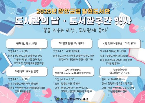 [½Åµ¿¾Æ¹æ¼Û °æ³²ÇÔ¾È=À̽ŵ¿±âÀÚ] ÇԾȱº¸³ Ä¥¿øµµ¼­°üÀº µµ¼­°üÀÇ ³¯(4.12.)°ú µµ¼­°ü ÁÖ°£(4.12.~18.)À» ¸Â¾Æ 4¿ù ÇÑ ´Þ µ¿¾È ´Ù¾çÇÑ ¹®È­Çà»ç¸¦ °³ÃÖÇÑ´Ù. À̹ø Çà»ç´Â ¡®²ÞÀ» Ű¿ì´Â ¾¾¾Ñ, µµ¼­°ü¿¡ ¹¯´Ù¡¯¶ó´Â ÁÖÁ¦·Î ´Ù¾çÇÑ ÇÁ·Î±×·¥ µéÀ» ¼±º¸ÀÏ ¿¹Á¤ÀÌ´Ù.¡¦