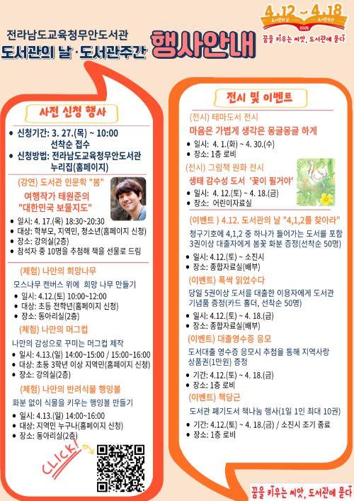 [½Åµ¿¾Æ¹æ¼Û Àü³²=À̽ŵ¿±âÀÚ] Àü¶ó³²µµ±³À°Ã»¹«¾Èµµ¼­°üÀº µµ¼­°üÀÇ ³¯ ¹× µµ¼­°üÁÖ°£À» ¸Â¾Æ 4¿ù 12ÀÏ(Åä)ºÎÅÍ 18(±Ý)±îÁö¡®²ÞÀ» Ű¿ì´Â ¾¾¾Ñ, µµ»ç°ü¿¡ ¹¯´Ù¡¯¸¦ ÁÖÁ¦·Î ´Ù¾çÇÑ µ¶¼­¹®È­ Çà»ç¸¦ ¿î¿µÇÑ´Ù. µµ¼­°üÀº Áö¿ª¹ÎÀÇ µµ¼­°ü¿¡ ´ëÇÑ ÀÌÇØ¿Í °ü½ÉÀ» ³ôÀÌ°í¡¦