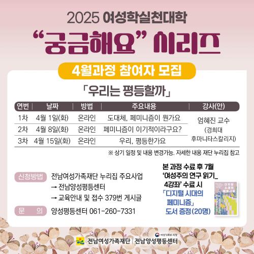 [½Åµ¿¾Æ¹æ¼Û Àü³²±¤ÁÖ=¹Ú±¤¿Á±âÀÚ] Àü³²¿©¼º°¡Á·Àç´ÜÀº ¿©¼ºÁÖÀÇ¿¡ ´ëÇÑ ÀÌÇØ¸¦ È®ÀåÇϰí, ÀÏ»óÀÇ ¼ºÆòµî ½ÇÇöÀ» ´Ù¾çÇÑ ¹æ¹ýÀ¸·Î ¸ð»öÇÏ´Â ¡°2025 ¿©¼ºÇнÇõ´ëÇС±À» 4¿ù 1ÀÏ(È­) 19½Ã ¿Â¶óÀÎÀ¸·Î °³°­ÇÏ¿´´Ù. ❏ ¿©¼ºÇнÇõ´ëÇÐÀº 7³â° ¿î¿µÇÏ´Â °úÁ¤À¸·Î,¡¦