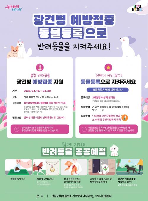 [½Åµ¿¾Æ¹æ¼Û µ¿´ë¹®±¸=À̽ŵ¿±âÀÚ] ¼­¿ï µ¿´ë¹®±¸´Â ±¤°ßº´ ¿¹¹æÀ» À§ÇØ 4¿ù 16ÀÏ(¼ö)ºÎÅÍ 30ÀÏ(¼ö)±îÁö °ü³» µ¿¹°º´¿ø 30°³¼Ò¿¡¼­ ¡®º½Ã¶ ±¤°ßº´ ¿¹¹æÁ¢Á¾¡¯À» ½Ç½ÃÇÑ´Ù. ¿¹¹æÁ¢Á¾ ´ë»óÀº Áö³­ÇØ °¡À»Ã¶¿¡ ¿¹¹æÁ¢Á¾À» ÇÏÁö ¾ÊÀº, °ü³»¿¡¼­ ±â¸£´Â »ýÈÄ 3°³¿ù ÀÌ»óÀΡ¦