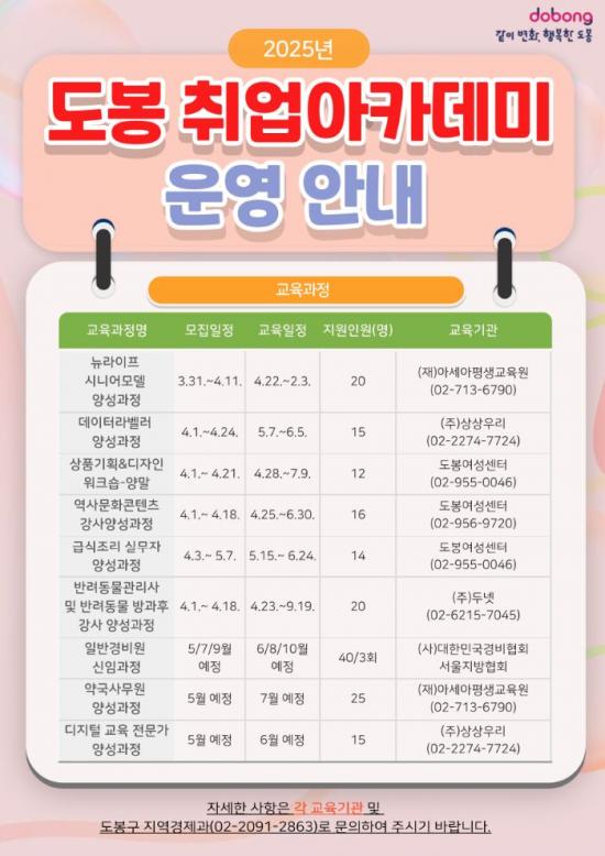 [½Åµ¿¾Æ¹æ¼Û µµºÀ±¸=À̽ŵ¿±âÀÚ] ¼­¿ï µµºÀ±¸°¡ ±¸¹ÎµéÀÇ Ãë¾÷ Áö¿øÀ» À§ÇØ µµºÀ Ãë¾÷¾ÆÄ«µ¥¹Ì¸¦ ¿î¿µÇÑ´Ù. º» »ç¾÷Àº ±¸ÀΡ¤±¸Á÷ ¼ö¿ä°¡ ¸¹Àº Á÷¾÷±º¿¡ ´ëÇØ Àü¹®Á÷¾÷±³À°À» Á¦°øÇÏ´Â »ç¾÷ÀÌ´Ù. ¿ÃÇØ´Â ÃÑ 9°³ °úÁ¤ÀÌ ¿î¿µµÈ´Ù. ±× Áß ½Ã´Ï¾î¸ðµ¨ ¾ç¼º°úÁ¤, µ¥ÀÌ¡¦