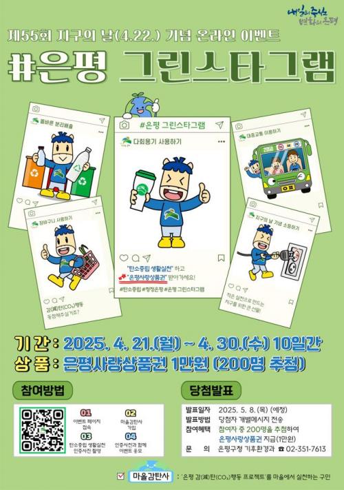 [½Åµ¿¾Æ¹æ¼Û ÀºÆò±¸=À̽ŵ¿±âÀÚ] ¼­¿ï ÀºÆò±¸´Â 4¿ù 22ÀÏÀÎ Á¦55ȸ Áö±¸ÀÇ ³¯À» ±â³äÇØ ¡®#ÀºÆò ±×¸°½ºÅ¸±×·¥¡¯ ¿Â¶óÀÎ À̺¥Æ®¸¦ ¿À´Â 21ÀϺÎÅÍ 30ÀϱîÁö ÃÑ 10Àϰ£ °³ÃÖÇÑ´Ù°í ¹àÇû´Ù. ÃÖ±Ù Àü ¼¼°èÀûÀ¸·Î Æø¿°, °¡¹³, »êºÒ µî ±âÈÄ À§±â°¡ ½É°¢ÇØÁ® ź¼Ò¹èÃâ °¨ÃàÀÇ¡¦