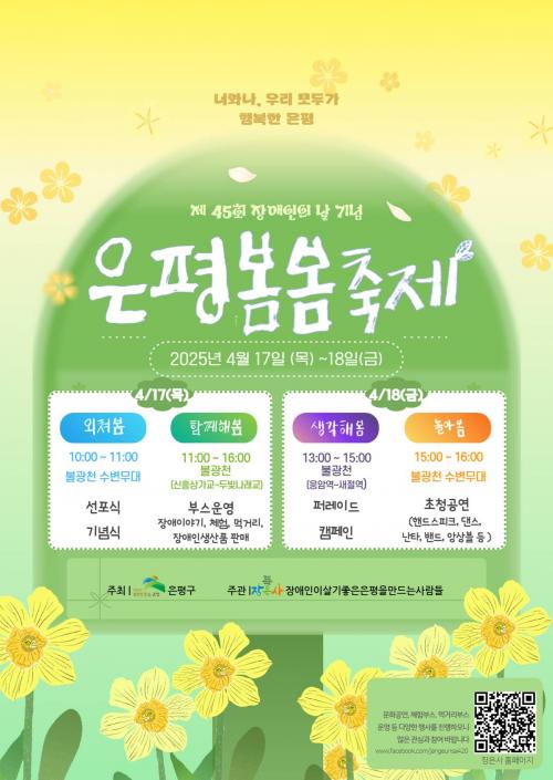 [½Åµ¿¾Æ¹æ¼Û ÀºÆò±¸=À̽ŵ¿±âÀÚ] ¼­¿ï ÀºÆò±¸´Â Á¦45ȸ Àå¾ÖÀÎÀÇ ³¯ ±â³äÇØ ¿À´Â 17ÀϺÎÅÍ 18ÀϱîÁö ºÒ±¤Ãµ¿¡¼­ Àå¾ÖÀΰú ºñÀå¾ÖÀÎ ÇÔ²² Âü¿©ÇÏ´Â ¼ÒÅë°ú È­ÇÕÀÇ ÀåÀÎ ¡®ÀºÆòº½º½ÃàÁ¦¡®¸¦ °³ÃÖÇÑ´Ù°í ¹àÇû´Ù. 17ÀÏ ¸ñ¿äÀÏ¿¡´Â ÀÀ¾Ï¿ª Àα٠ºÒ±¤Ãµ ¼öº¯¹«´ë¿¡¼­ ¿ÀÀü ¡¦