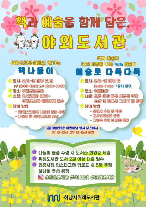 [½Åµ¿¾Æ¹æ¼Û Çϳ²½Ã=À̽ŵ¿±âÀÚ] Çϳ²½Ã´Â ¿Ï¿¬ÇÑ º½±â¿î ¼Ó¿¡¼­ ½Ã¹ÎµéÀÌ ÀÚ¿¬°ú Ã¥À» ÇÔ²² Áñ±æ ¼ö ÀÖµµ·Ï, 5¿ù 3ÀϺÎÅÍ 31ÀϱîÁö ¸ÅÁÖ Å䡤ÀÏ¿äÀÏ À§·Ê±Ù¸°°ø¿ø5È£¿¡¼­ ¾ß¿Üµµ¼­°ü ÇÁ·Î±×·¥ÀÎ ¡®Ã¥°ú ¿¹¼úÀ» ÇÔ²² ´ãÀº Ã¥ ³ªµéÀÌ¡¯¸¦ ¿î¿µÇÑ´Ù. À̹ø Çà»ç´Â ¡®Ã¥°ú¡¦