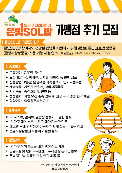 [½Åµ¿¾Æ¹æ¼Û ÀºÆò±¸=À̽ŵ¿±âÀÚ] ¼­¿ï ÀºÆò±¸´Â Àú¼Òµæ ÁßÀå³â 1ÀÎ °¡±¸¸¦ ´ë»óÀ¸·Î °Ç°­ÇÑ ½Ä»ýȰÀ» Áö¿øÇÏ´Â ¡®ÀººûSOL¹ä¡¯ »ç¾÷¿¡ Âü¿©ÇÒ ¹ÝÂù°¡°Ô °¡¸ÍÁ¡À» ¿À´Â 7¿ù 31ÀϱîÁö ¸ðÁýÇÑ´Ù°í ¹àÇû´Ù. ¡®ÀººûSOL¹ä¡¯Àº ÀºÆò±¸ÀÇ ºû³ª´Â 1Àΰ¡±¸(SOLO)¿¡ °Ç°­ÇÑ Áý¡¦