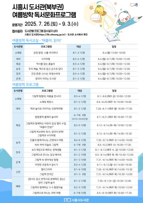 [½Åµ¿¾Æ¹æ¼Û ½ÃÈï½Ã=À̽ŵ¿±âÀÚ] ½ÃÈï½Ã´Â ¿©¸§¹æÇÐÀ» ¸Â¾Æ ºÏºÎ±Ç 8°³ °ø°øµµ¼­°ü(¼Ò·¡ºû¤ý´ë¾ß¤ý¸ñ°¨¤ý´É°î¤ýÀå°î¤ýÀº°è¤ý½Åõ¤ý¸ÅÈ­)ÀÌ 7¿ù 26ÀϺÎÅÍ 9¿ù 3ÀϱîÁö ¿©¸§µ¶¼­±³½Ç ¹× ¿©¸§¹æÇÐ ÇÁ·Î±×·¥À» ¿î¿µÇÑ´Ù°í ¹àÇû´Ù. À̹ø ¿©¸§µ¶¼­±³½Ç ¹× ¿©¸§¹æÇÐ ÇÁ·Î±×·¥¡¦