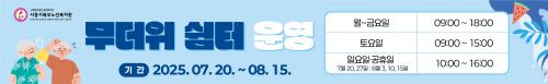 [½Åµ¿¾Æ¹æ¼Û ½ÃÈï½Ã=À̽ŵ¿±âÀÚ] ½ÃÈï½ÃºÏºÎ³ëÀκ¹Áö°ü(ÀÌÇÏ, ³ëÀκ¹Áö°ü)Àº ¿©¸§Ã¶ Æø¿°À¸·Î ÀÎÇÑ ¿Â¿­ÁúȯÀ» ¿¹¹æÇÏ°í ¾î¸£½ÅµéÀÇ °Ç°­°ú ¾ÈÀüÀ» Áö۱â À§ÇØ 7¿ù 20ÀϺÎÅÍ 8¿ù 15ÀϱîÁö ¹«´õÀ§½°Å͸¦ ¿î¿µÇÑ´Ù. ¹«´õÀ§½°ÅÍ´Â º¹Áö°üÀÌ ¿î¿µµÇ´Â ¿ù¿äÀÏ¿¡¼­ ±Ý¿äÀÏ¡¦