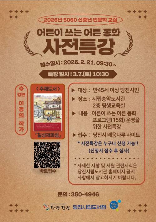 [½Åµ¿¾Æ¹æ¼Û=ÀÌÀçö±âÀÚ] ´çÁø½Ã´Â ¼Û¾Çµµ¼­°ü¿¡¼­ ¼¼´ë ¸ÂÃãÇü ±Û¾²±â ÇÁ·Î±×·¥ÀÇ ÀÏȯÀ¸·Î ¸¸ 45¼¼ ÀÌ»óÀ» ´ë»óÀ¸·Î ÇÑ ¡®¾î¸¥ÀÌ ¾²´Â ¾î¸¥µ¿È­(2026³â 5060 ½ÅÁß³â Àι®ÇÐ ±³½Ç)¡¯¸¦ ¿î¿µÇÑ´Ù°í 4ÀÏ ¹àÇû´Ù. À̹ø °úÁ¤Àº ¿À´Â 7ÀÏ ¿ÀÀü 10½Ã 30ºÐ »çÀü Ư°­À» ½ÃÀÛ¡¦