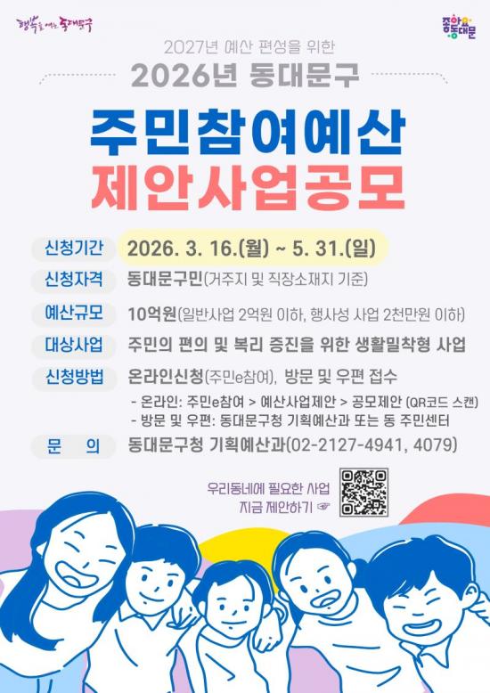 [½Åµ¿¾Æ¹æ¼Û µ¿´ë¹®±¸=À̽ŵ¿±âÀÚ] ¼­¿ï µ¿´ë¹®±¸´Â 2027³â ¿¹»êÆí¼ºÀ» À§ÇÑ 2026³âµµ ¡®ÁÖ¹ÎÂü¿©¿¹»ê»ç¾÷ ¾ÆÀ̵ð¾î °ø¸ð¡¯¸¦ 5¿ù 31ÀϱîÁö ÁøÇàÇÑ´Ù. ¡®ÁÖ¹ÎÂü¿©¿¹»êÁ¦µµ¡¯´Â ¿¹»ê Æí¼º °úÁ¤ÀÇ ÁÖ¹ÎÂü¿© ±âȸ¸¦ º¸ÀåÇϰí ÀçÁ¤¿î¿µÀÇ °ÇÀü¼º ¹× Åõ¸í¼ºÀ» È®º¸Çϱâ À§¡¦